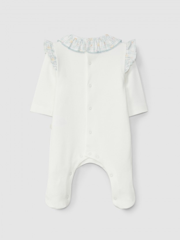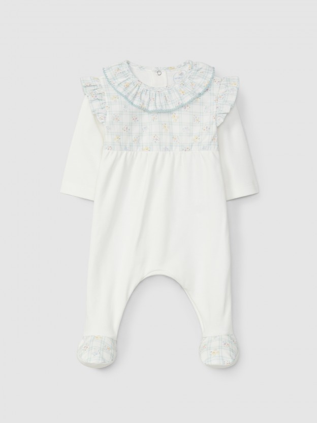 Babygrow em malha 100% algodão. Encaixe no peito e pés em tecido de quadricula e flores. Folho na gola e ombros com detalhe de picueta à cor. Aperta com molas nas costas e no entrepernas.