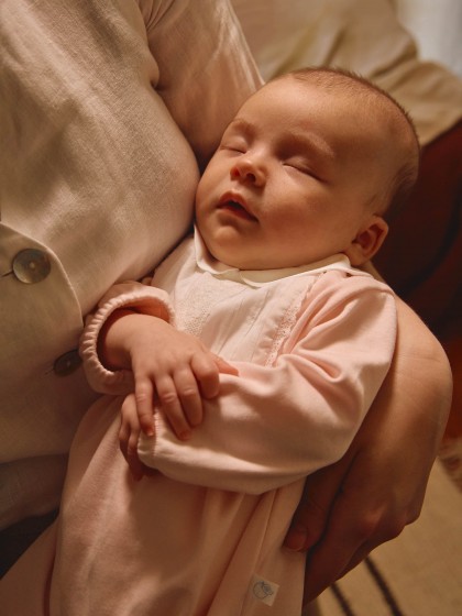 Babygrow em malha 100% algodão com gola redonda em tecido. Encaixe em tecido no peito com pregas e aplicação de renda delicada. Aperta com molas nas costas e no entrepernas.