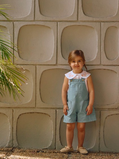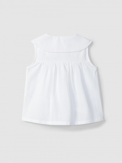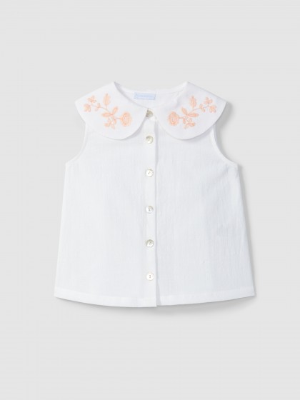 Blusa em tecido texturado 100% algodão com bordado delicado na gola. Aperta com botões madrepérola Laranjinha na frente a todo o comprimento.
