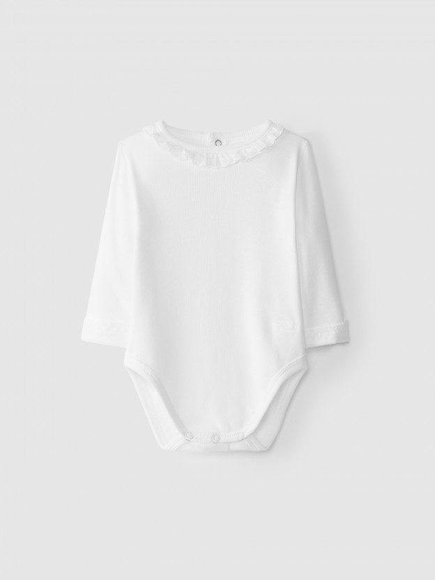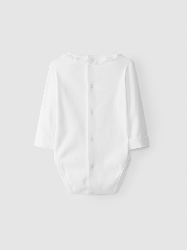 Body de manga comprida, em malha antibacteriana de algodão. Gola de folho com bordado inglês. Até aos 6 meses, aperta com molas de pressão a todo o comprimento atrás e no entrepernas, para facilitar o vestir. A partir dos 6 meses, abertura com duas molas de pressão atrás e no entrepernas.