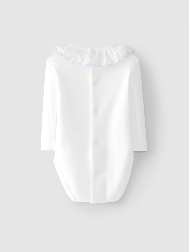 Body em malha antibacteriana de algodão cardado manga comprida com gola de folho bordado. Aperta com molas nas costas e no entrepernas. Bordado na gola a azul bebé.