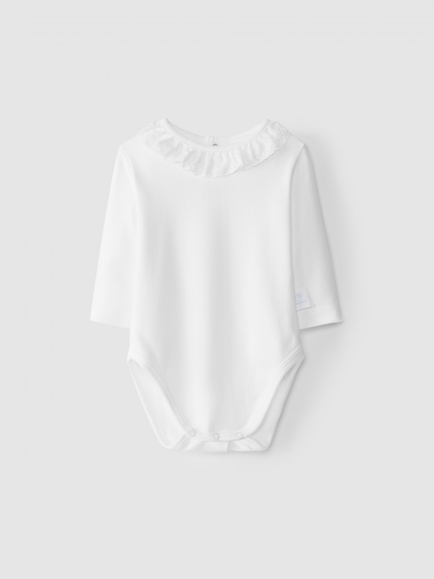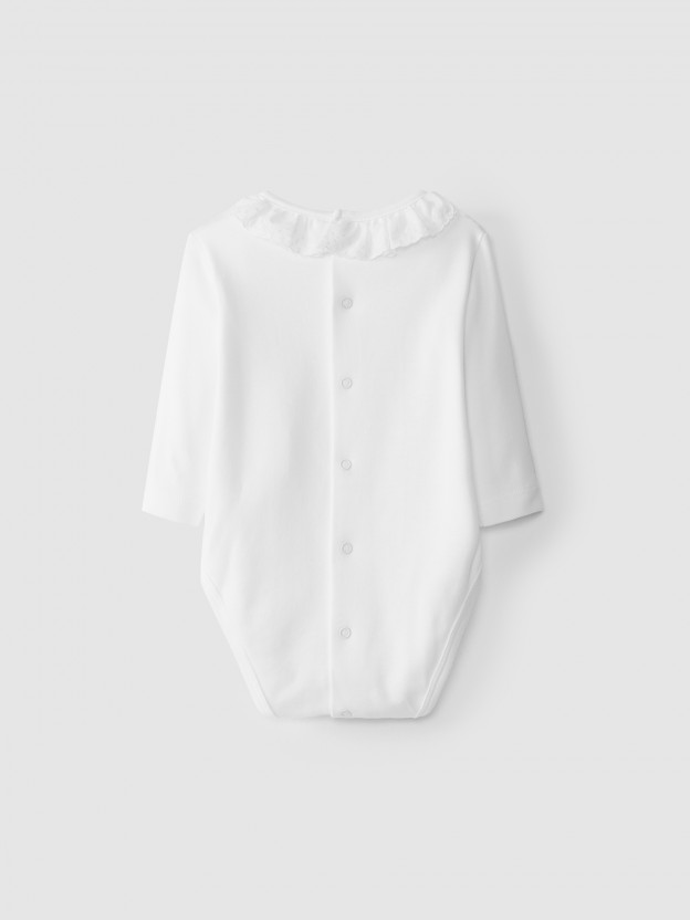 Body de manga comprida em malha de algodão. Gola de folho em bordado inglês branco. Até aos 6 meses, aperta com molas de pressão a todo o comprimento atrás e no entrepernas, para facilitar o vestir. A partir dos 6 meses, abertura com duas molas de pressão atrás e no entrepernas.