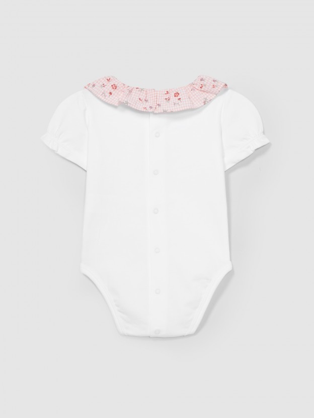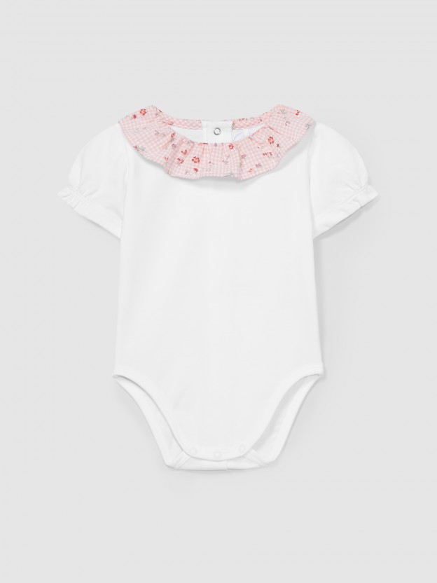 Body em malha de algodão com gola de folho em tecido seersucker xadrez vichy com flores. Aperta com molas nas costas e no entrepernas.