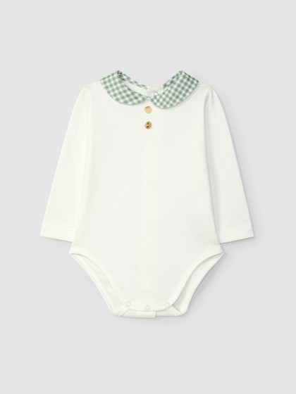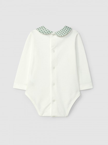 Body em malha 100% algodão cardado com gola redonda em tecido xadrez. Botões Laranjinha decorativos na frente. Aperta com molas nas costas e no entrepernas.