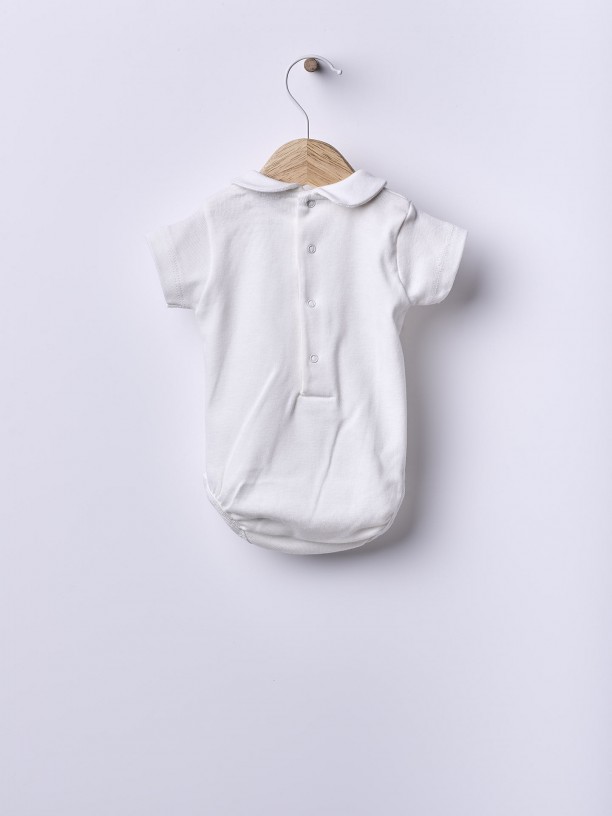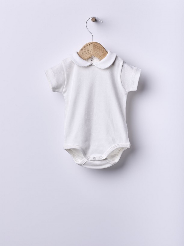 Body crú de manga curta em malha de algodão leve. O body, com gola redonda em malha de algodão suave, aperta nas costas e entre as pernas com molas.