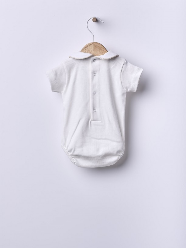 Body de manga curta ideal para bebés. O body de manga curta é produzido em malha pérola de algodão leve, com gola redonda, em algodão. Aperta nas costas e entre as pernas com molas.