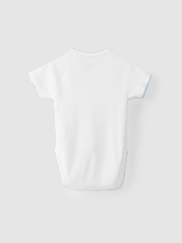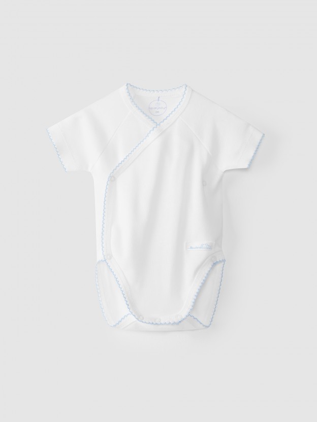 Body de trespasse em 100% algodão canelado 1×1 antibacteriano muito confortável, com picueta azul bebé.