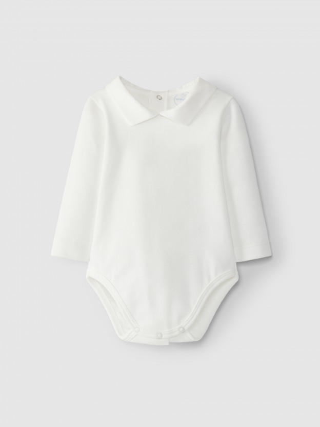 Body malha de algodão crú, cardado com gola de bico em tecido. Aperta com molas nas costas e no entrepernas.