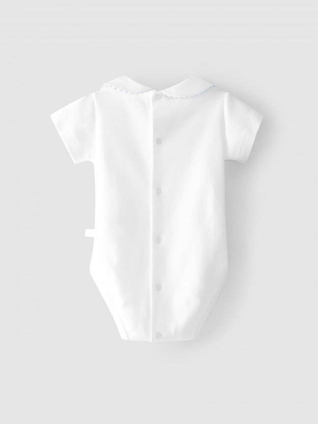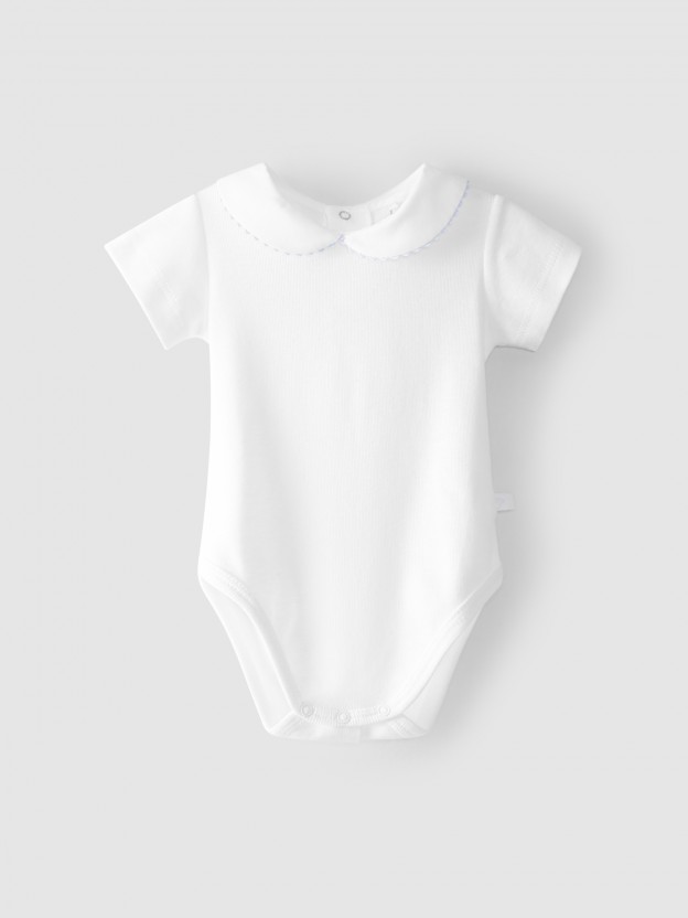 Body em malha antibacteriana de algodão manga curta com gola peter pan e detalhe de picueta azul bebé. Aperta com molas nas costas e no entrepernas.