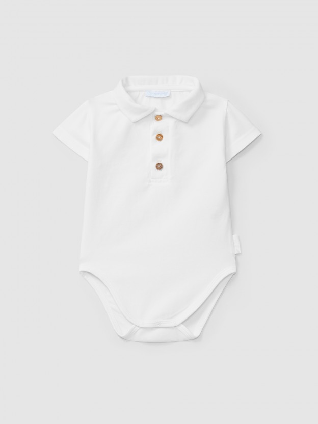 Body crú de manga curta em malha de algodão com gola de bico. Aperta com botões de madeira Laranjinha na frente e molas no entrepernas.