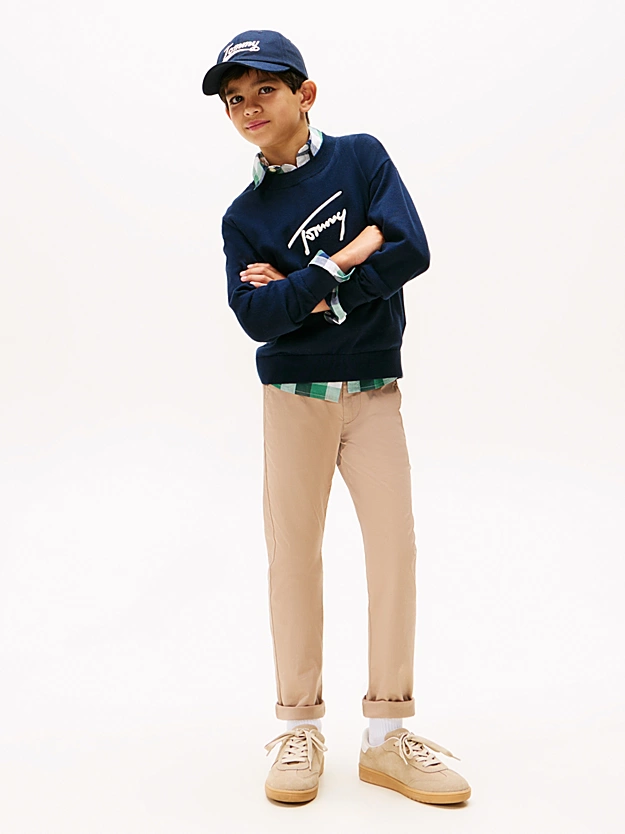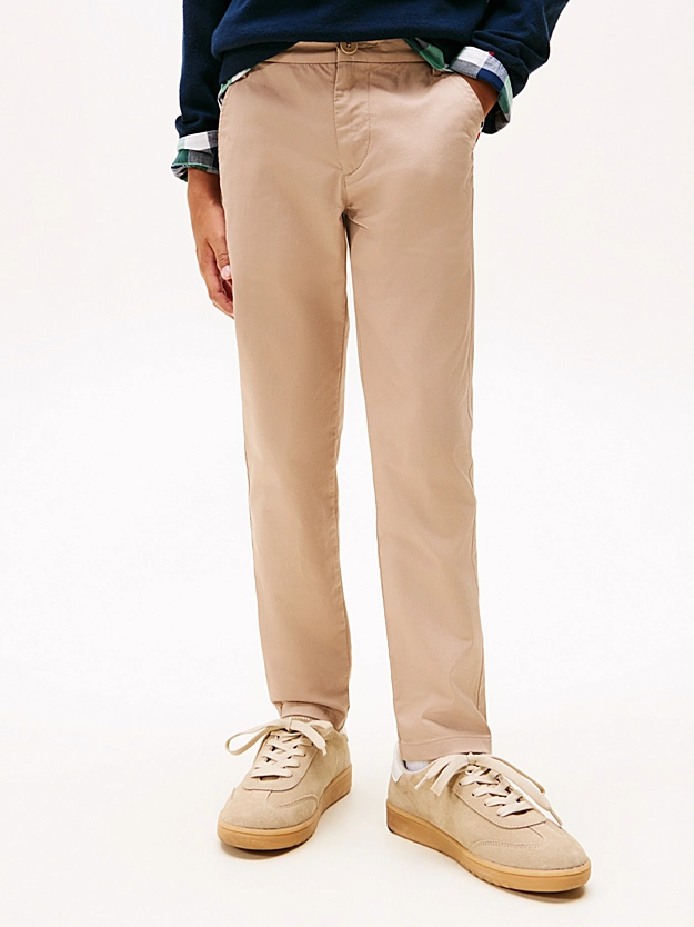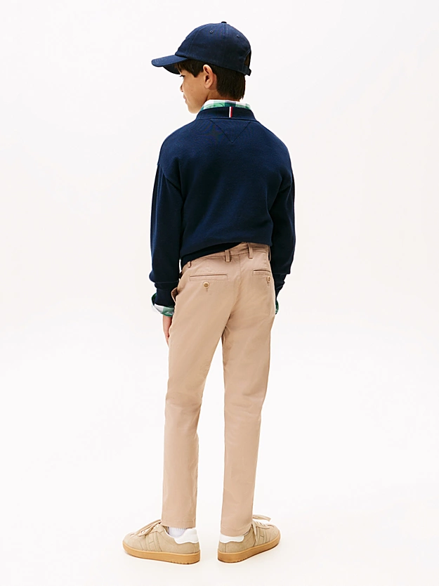Estas calças chino de sarja de algodão com elastano são perfeitas para festas, com seus bolsos elegantes e detalhes exclusivos na frente e atrás.
