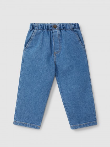 Calças pull-up em ganga leve e maleável com quatro bolsos funcionais. Mola decorativa na cintura. Elástico interior ajustável na cintura para uma melhor adaptação.