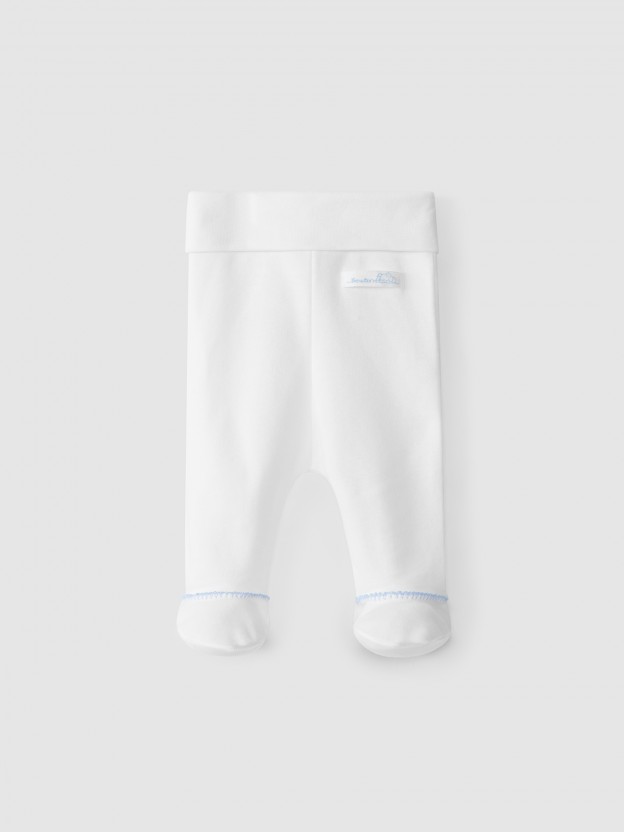 Calças com pés, muito confortáveis em 100% algodão canelado 1×1 antibacteriano, cujos detalhes incluem:- cós em malha canelada em branco- etiqueta “Laranjinha” na perna – acabamentos em picueta azul bebé.