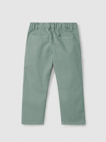Calças em sarja lisa muito maleável com quatro bolsos. Aperta na frente com botão e fecho de correr. Elástico interior ajustável na cintura para uma melhor adaptação.