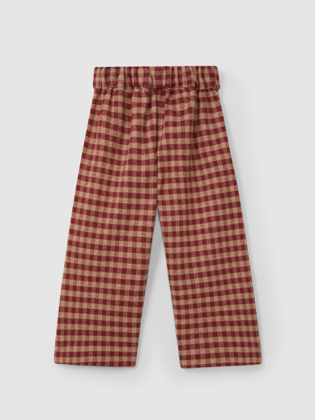 Calças pull-up em malha jacquard xadrez muito confortáveis e maleáveis. Botões decorativos Laranjinha na cintura.