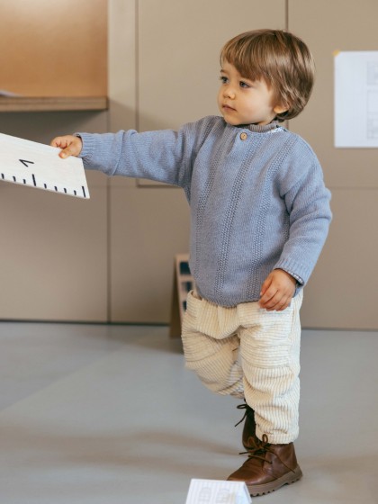 Calças pull-up em veludo canelado 100% algodão orgânico com bolsos funcionais na frente. Punho pode ser utilizado dobrado ou por inteiro para maior durabilidade. Botões de madeira decorativos na cintura.