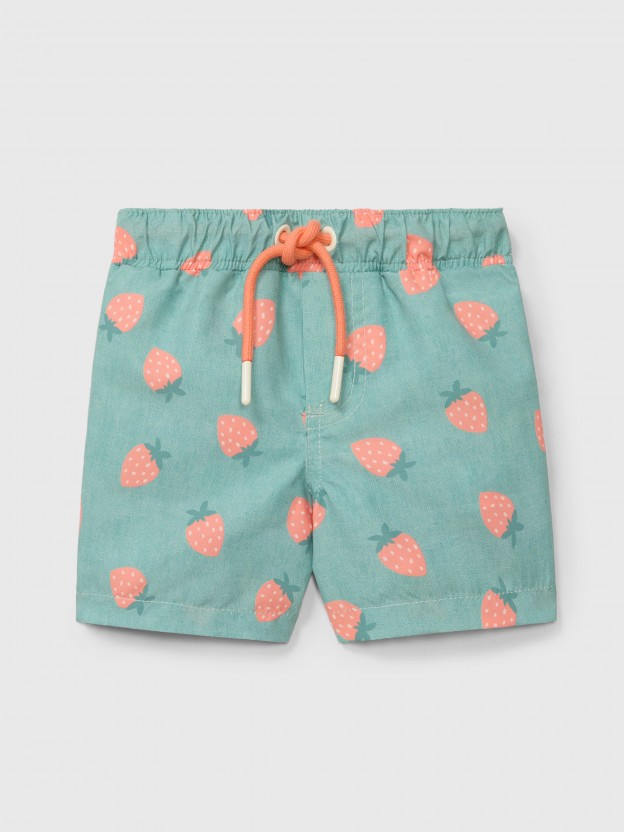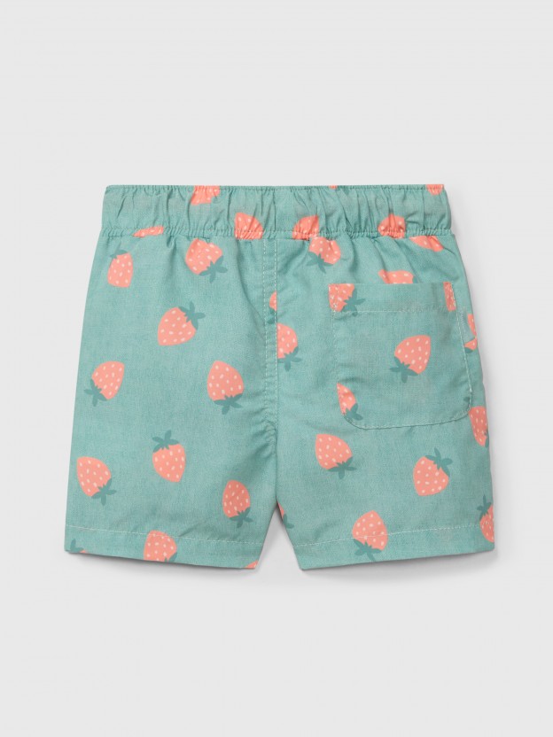 Calções de banho com estampado de morangos e bolso nas costas. Cordão funcional na cintura em cor contraste para uma melhor adaptação.
