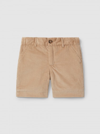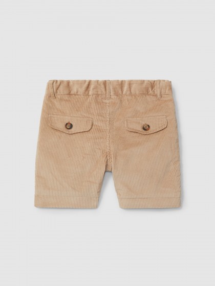 Calções em bombazine 100% algodão com bolsos funcionais na frente e decorativos nas costas. Elástico regulável na cintura para uma melhor adaptação. Aperta na frente com botão e fecho de correr.