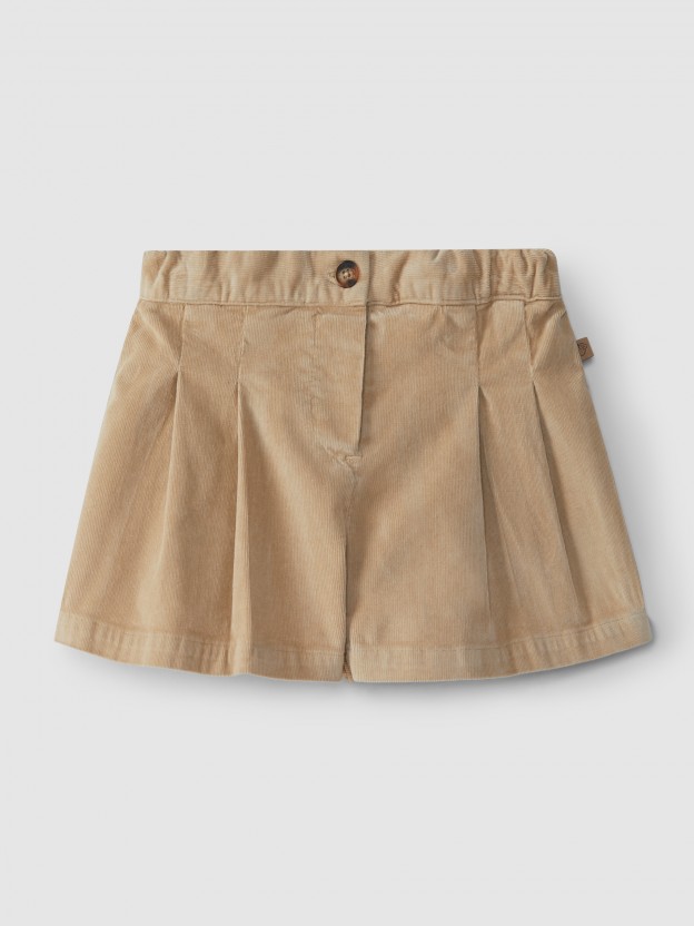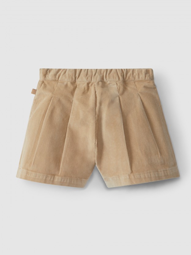Calções em micro-bombazine. Aperta na frente com botão e fecho de correr. Elástico na cintura ajustável para uma maior adaptabilidade.