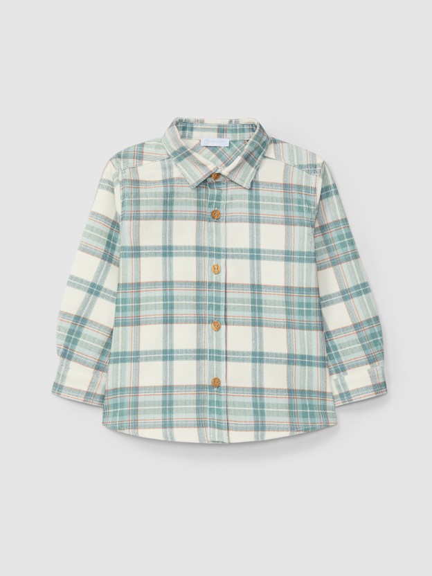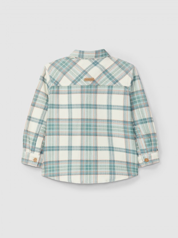 Camisa em bombazine 100% algodão com estampado de xadrez exclusivo Laranjinha . Aperta com botões de madeira Laranjinha na frente e nos punhos.