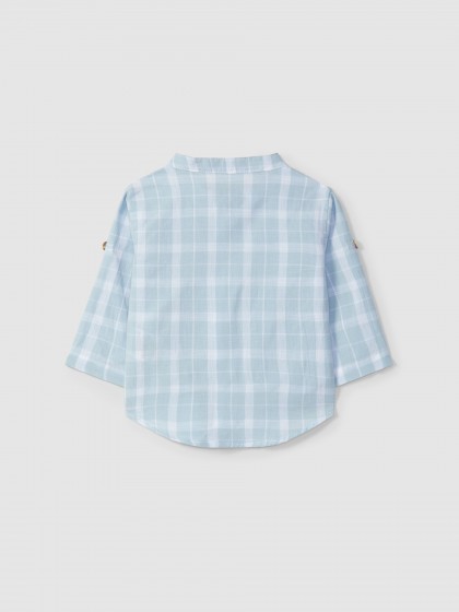 Camisa em tecido 100% algodão com estampado de xadrez. Presilha na manga para opção de manga curta. Aperta com botões na frente a todo o comprimento.