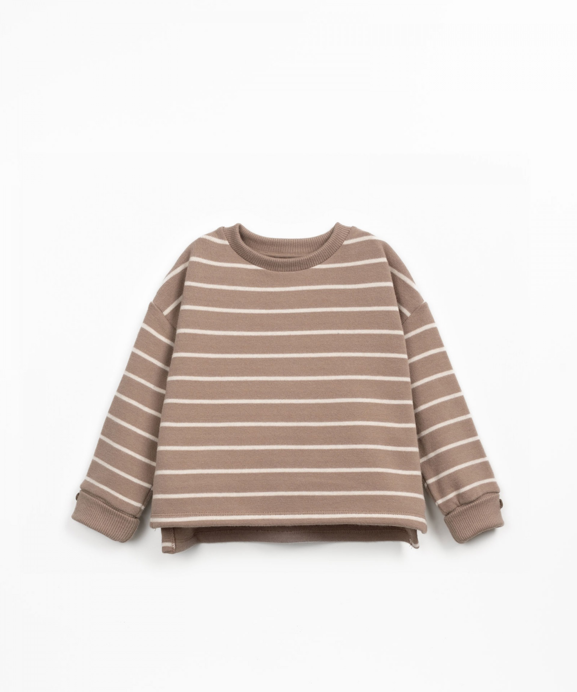 Esta camisola é feito em malha com mistura de algodão regenerativo e algodão reciclado, na cor Meio Branco. É um modelo com manga comprida, decote redondo e com padrão de riscas.