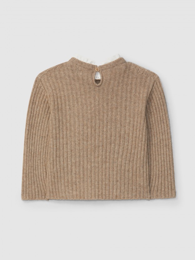 Camisola tricotada com um toque de caxemira e gola de folho em tecido amovível. Abertura em lágrima nas costas.