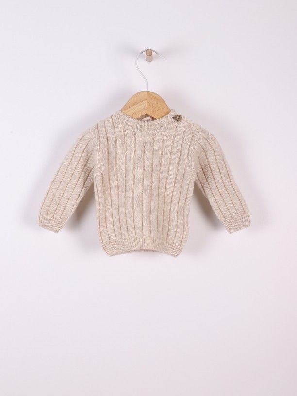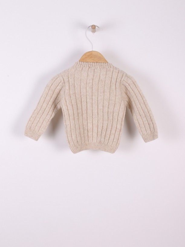 Camisola tricotada em malha suave de lã merino extrafina, ideal para bebés. A camisola de manga comprida BUNNY AND FRIENDS aperta no ombro com botões de côco. Produzida com a tecnologia Wholegarment, esta peça é completa e sem costuras, para maior conforto do seu bebé.