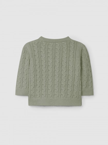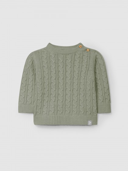 Camisola tricotada malha entrançada em lã merino, poliamida reciclada e um toque de caxemira. Aperta com botões de madeira no ombro até aos 24 meses.