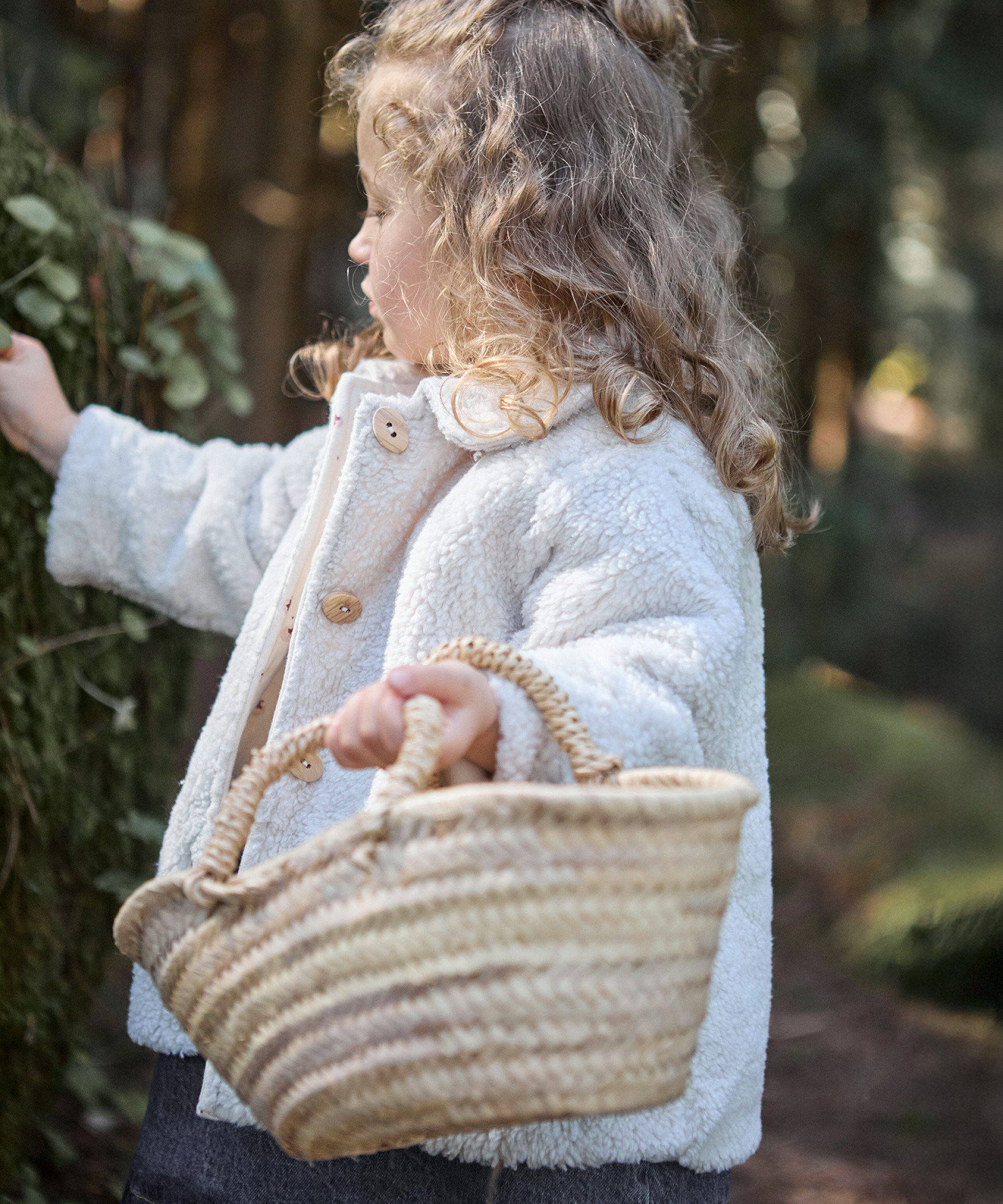 Este casaco pêlo é feito em malha de algodão orgânico, na cor Cru. É um modelo com forro de malha com mistura de algodão orgânico e algodão reciclado, aplicação de gola e tem abertura frontal com botões de madeira.