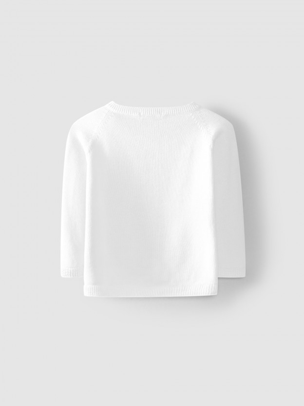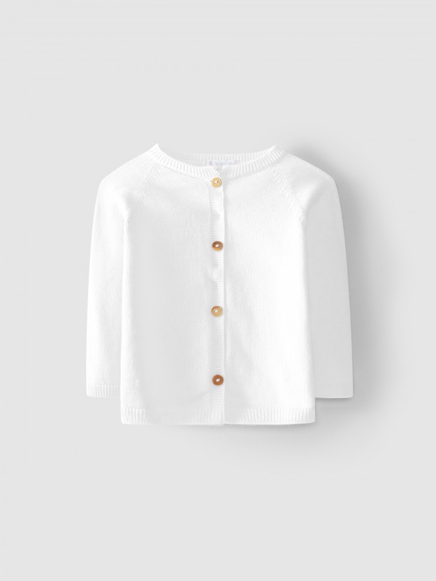 Casaco tricotado 100% algodão com decote redondo. Aperta com botões de madeira Laranjinha a todo o comprimento.