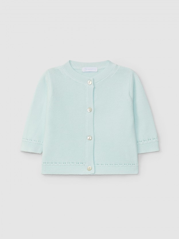 Casaco tricotado decote redondo 100% algodão em ponto links. Detalhe de efeito tricot decorativo.