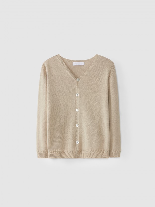 Casaco tricotado com decote em bico. Aperta com botões madrepérola Laranjinha a todo o comprimento.