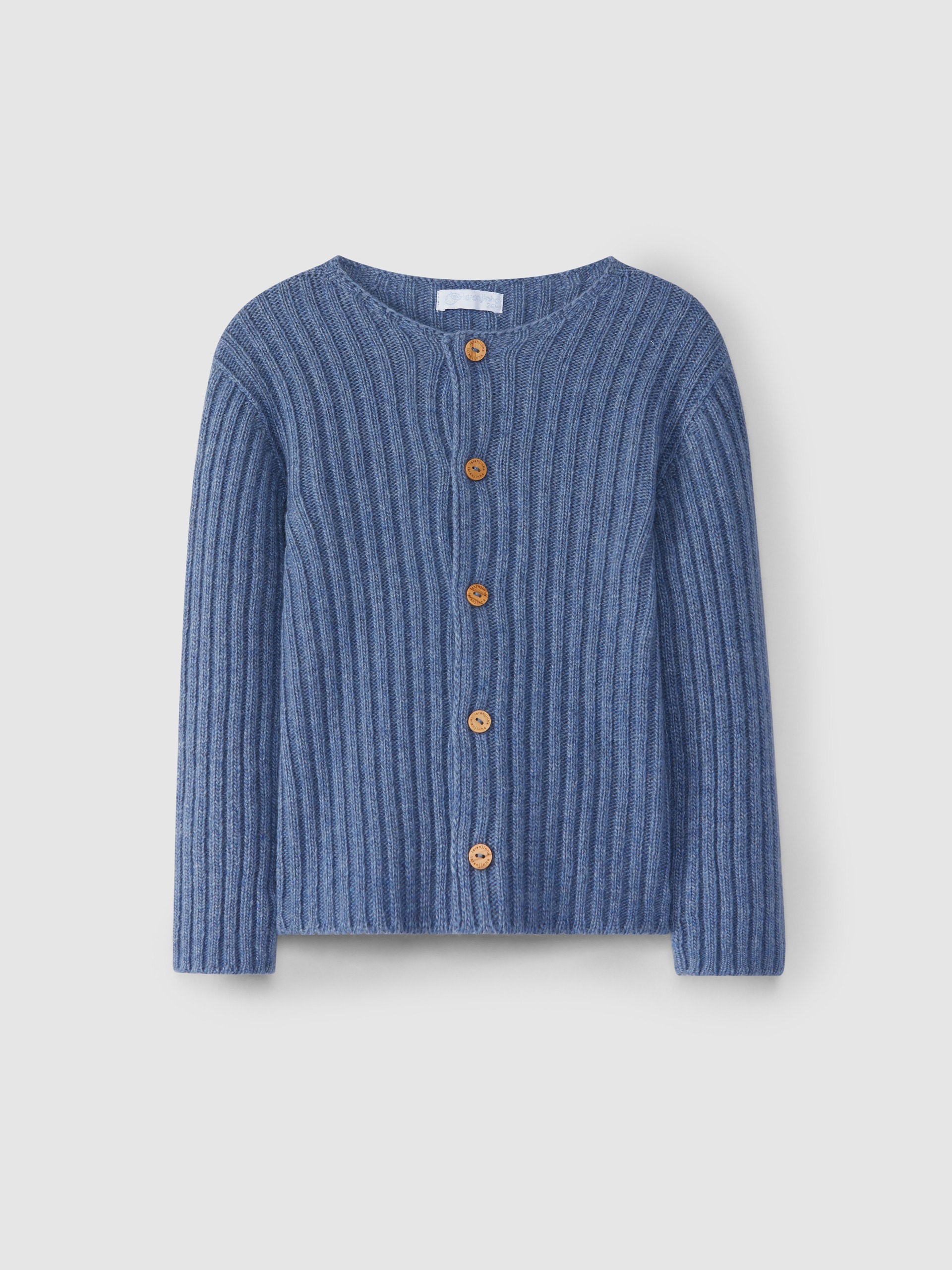Casaco tricotado decote redondo com um toque de caxemira. Aperta com botões de madeira Laranjinha na frente e todo o comprimentos.