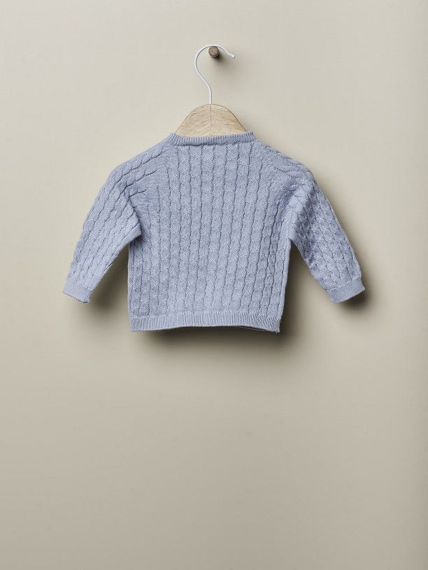 Casaco de manga comprida tricotado em malha de algodão orgânico, suave e respirável, ideal para bebés. O casaco LITTLE LOVE aperta na frente com botões de madeira. Produzido em Wholegarment, uma peça completa sem costuras, para maior conforto do seu bebé.
