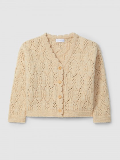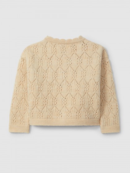 Casaco tricotado em fantasia. Aperta com botões de madeira Laranjinha na frente.