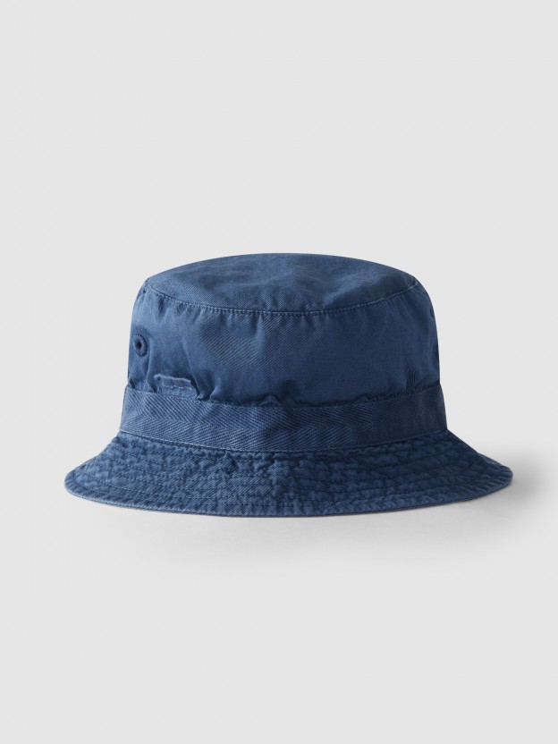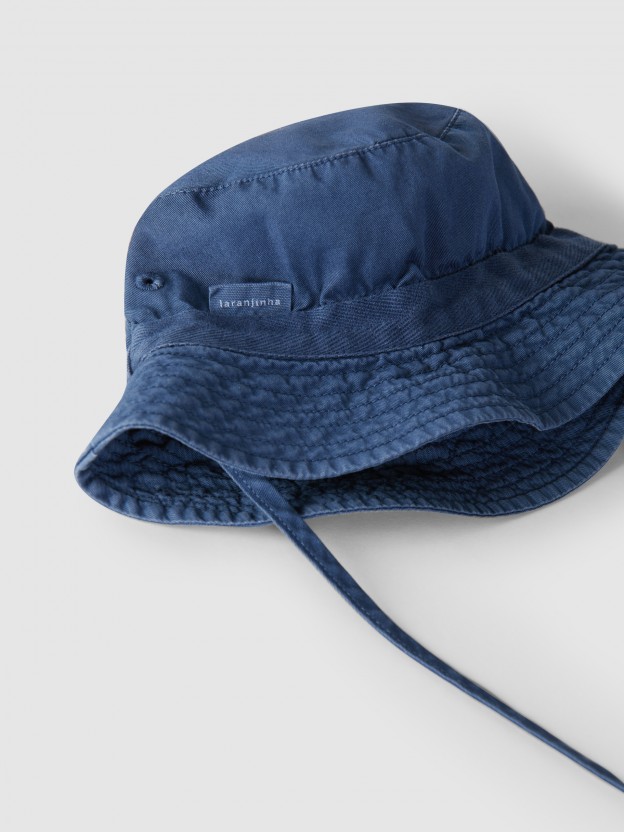 Chapéu liso em algodão com fita decorativa e etiqueta Laranjinha . Aperta com fita no mesmo tecido.