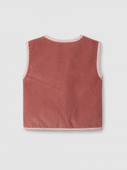 Colete em tecido duplo bombazine e pelo no interior com detalhes em tecido estampado. Aperta com alamar na frente.