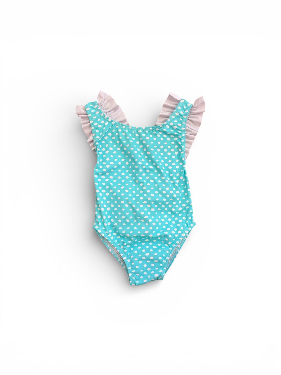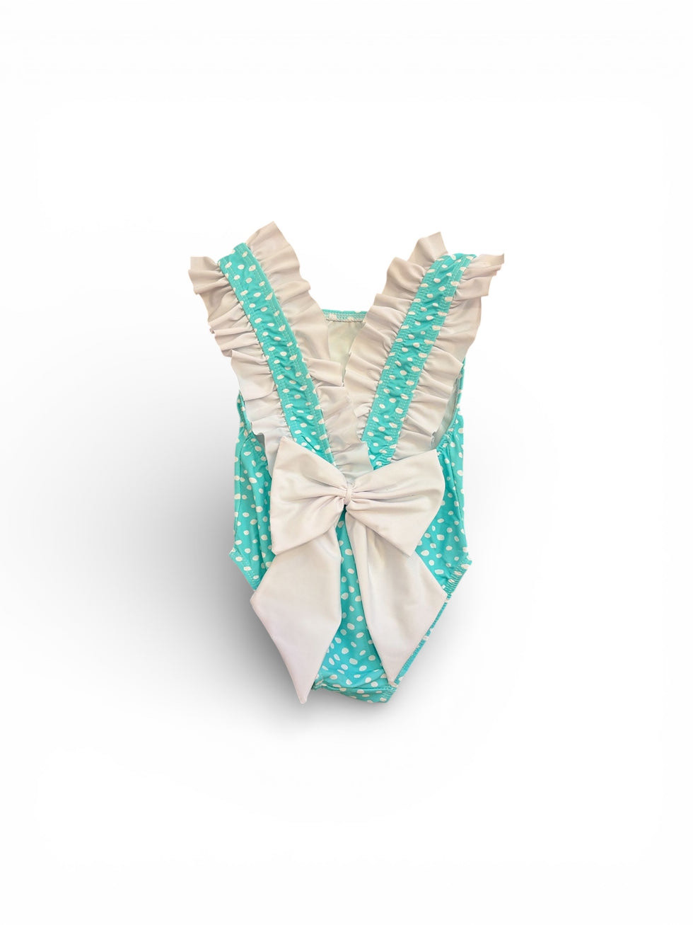 Fato de banho em lycra com estampa de bolinhas. As alças possuem folho e permitem também o ajuste perfeito.