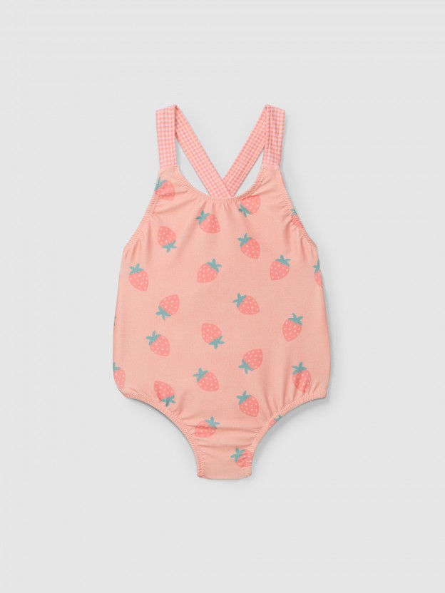 Fato de banho em lycra com estampado de morangos e alças em xadrez vichy. Aperta nas costas com laço para uma melhor adaptação.