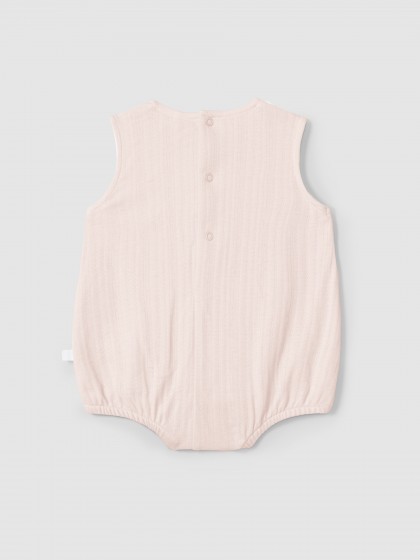 Fofo em malha dupla 100% algodão orgânico com efeito ajour. Encaixe em tecido no peito com detalhe bordado e botões madrepérola Laranjinha decorativos. Aperta com molas nas costas e no entrepernas.