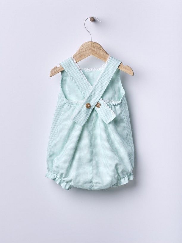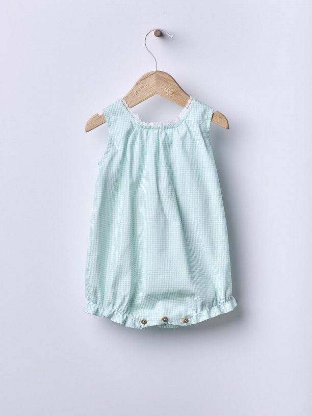 Fofo de alças ideal para bebés. O fofo BREEZE produzido em tecido de algodão orgânico suave com um encantador padrão xadrez Vichy e detalhes em renda. Aperta nas costas e entre as pernas com botões de madeira.