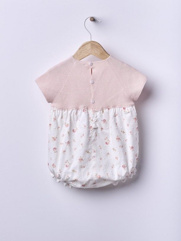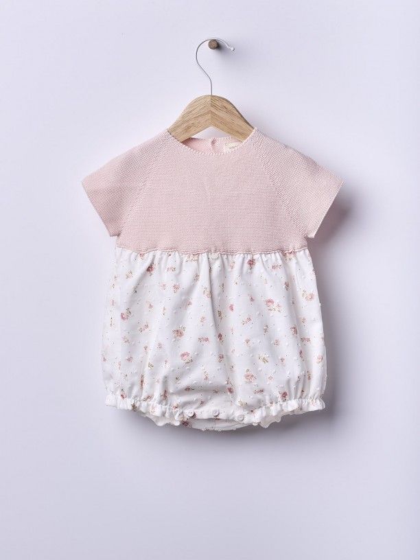 Fofo de manga curta com estampado floral. A parte do peito do fofo ROMANTIC SPRING DAY é suavemente tricotada em malha fina cor de rosa, em algodão orgânico, com um detalhe da marca decorativo na frente. A parte inferior é produzida em tecido de algodão suave, com um delicado estampado de flores rosa, com fundo pérola, forrada em algodão leve para maior conforto. Aperta nas costas e entre as pernas com botões madrepérola. Produzido em Wholegarment, uma peça completa sem costuras, para maior conforto do seu bebé.
