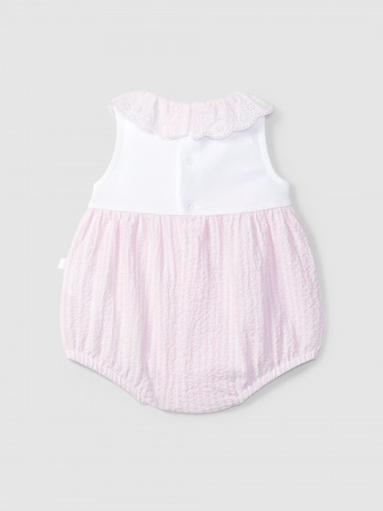 Parte de cima em malha de algodão com gola de folho e detalhe de bordado exclusivo Laranjinha . Parte de baixo em tecido seersucker de riscas. Aperta com molas nas costas e no entrepernas.