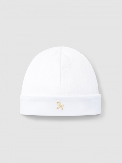 Gorro em malha dupla 100% algodão orgânico com efeito ajour no exterior e malha lisa no interior. Detalhe de bordado delicado.