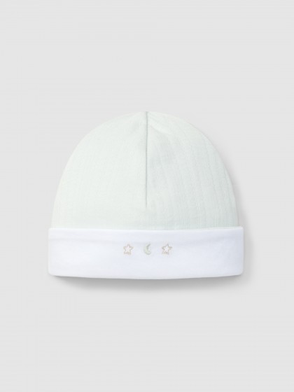Gorro em malha dupla 100% algodão orgânico com efeito ajour no exterior e malha lisa no interior. Detalhe de bordado delicado.