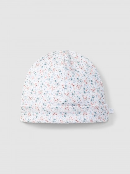 Gorro em malha 100% algodão estampado. Dobra para uma melhor adaptação à cabeça do bebé.