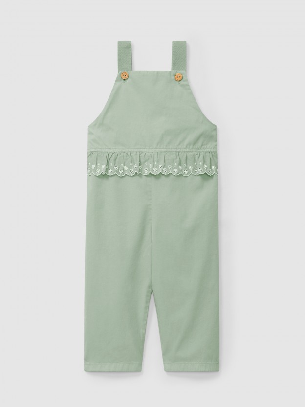 Jardineiras lisas em sarja 100% algodão muito maleável e confortável. Aplicação de folho com bordado inglês a toda a volta e detalhe de fita cruzada nas costas. Aperta com botões de madeira Laranjinha nas alças em duas posições.