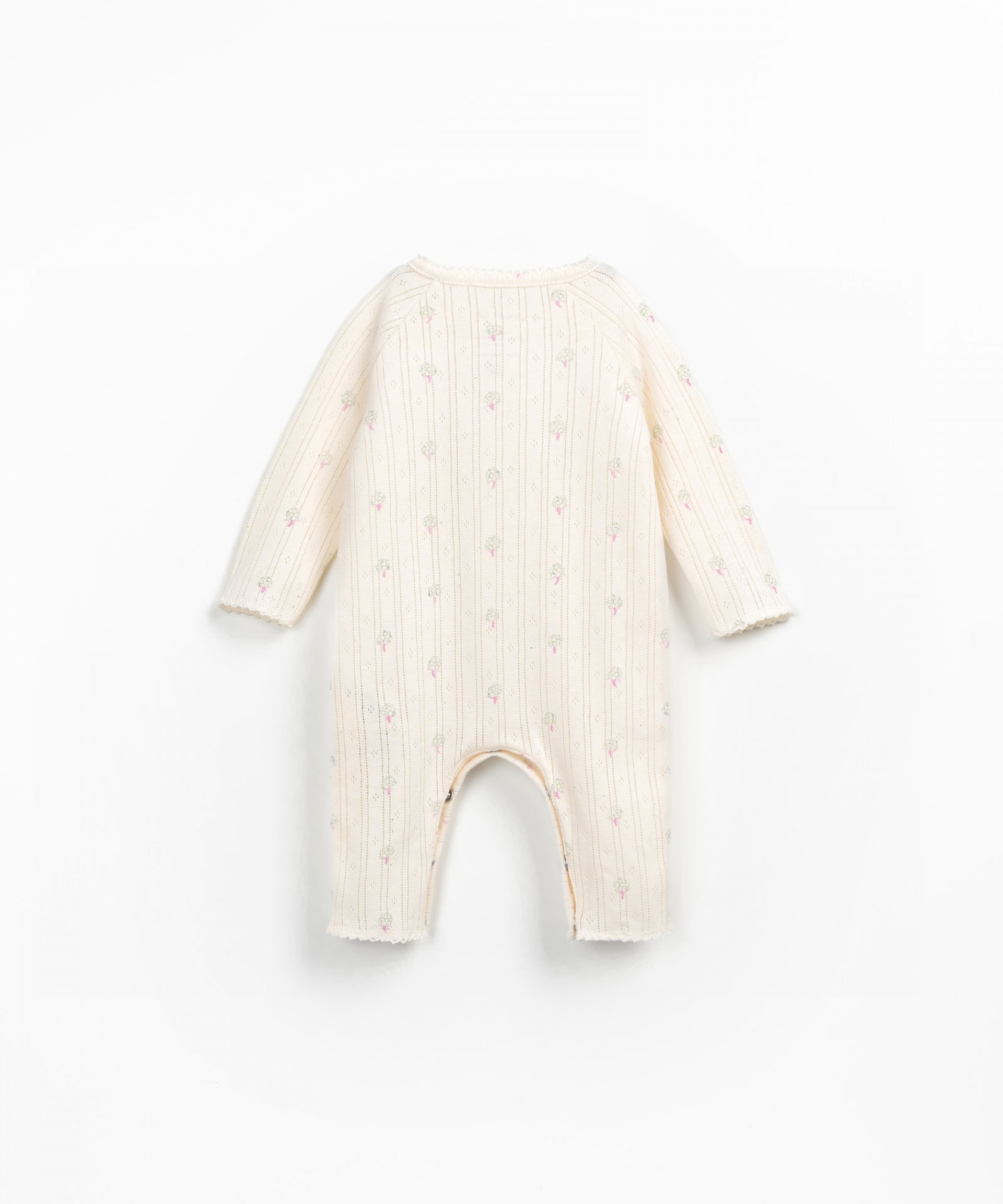 Este macacão é feito em malha com mistura de algodão orgânico e algodão reciclado, na cor Grés. É um modelo de manga comprida com decote redondo, abertura frontal com botões de madeira, abertura entre pernas com molas de metal sem níquel e estampado de alcachofras.