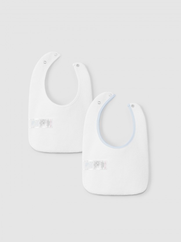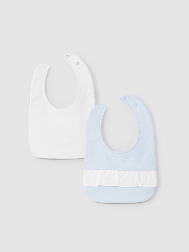 Pack dois babetes forradas a turco impermeável. Molas reguláveis no pescoço para se adaptarem ao crescimento do bebé. Um com detalhe de folho com bordado inglês e outro lisa. Perfeitos para completar os looks do seu bebé.